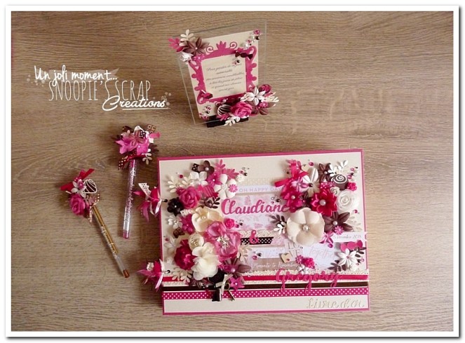 romantique chic fleuri, gourmandises, rose fushia, fuchsia, fuschia, ivoire, blanc cassé, chocolat, marron, bonbons, fleurs, strass, perles, roses, pivoines, orchidées, arabesques,romantisme,mariage, pacs, mariage Claudiane & Grégory, cadre décoré, chevalet, décoration de table, information livre d’or, verre.