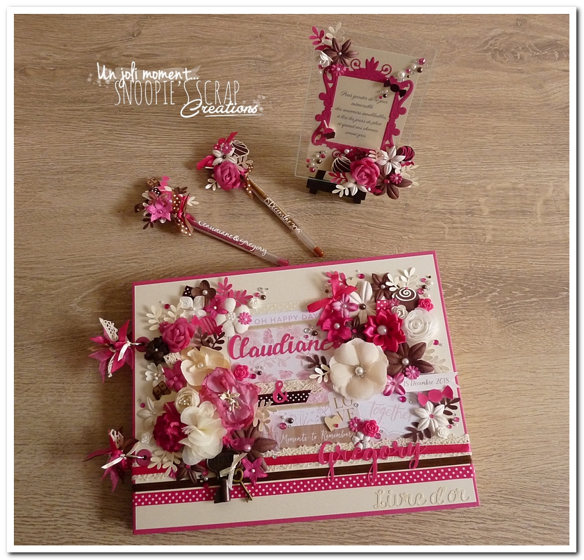 romantique chic fleuri, gourmandises, rose fushia, fuchsia, fuschia, ivoire, blanc cassé, chocolat, marron, bonbons, fleurs, strass, perles, roses, pivoines, orchidées, arabesques,romantisme,mariage, pacs, mariage Claudiane & Grégory, cadre décoré, chevalet, décoration de table, information livre d’or, verre.