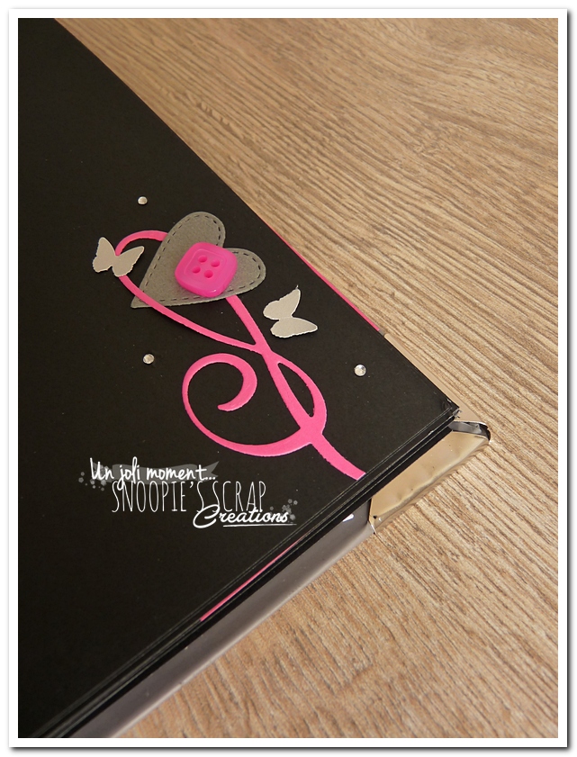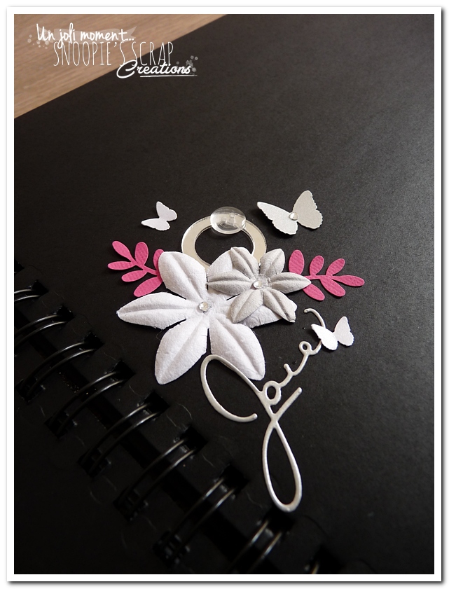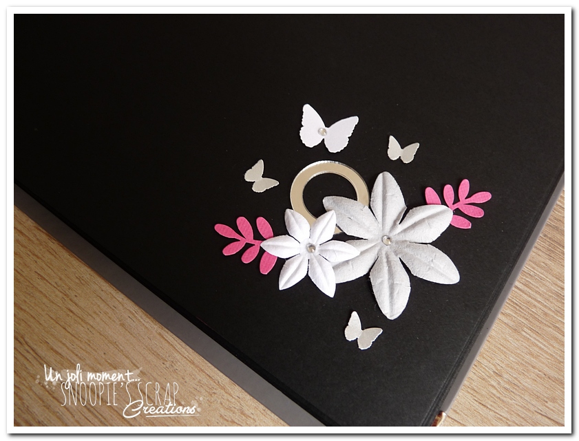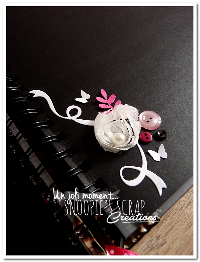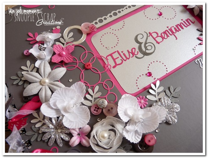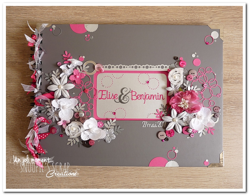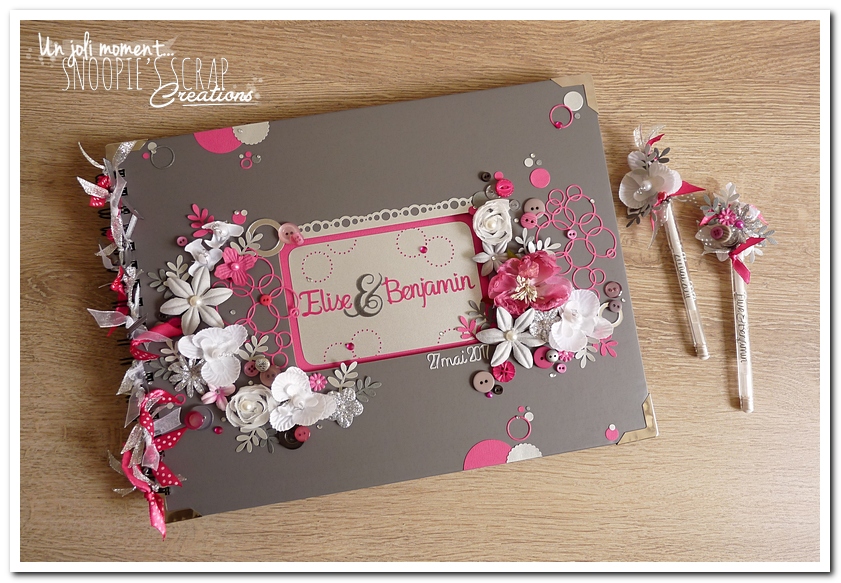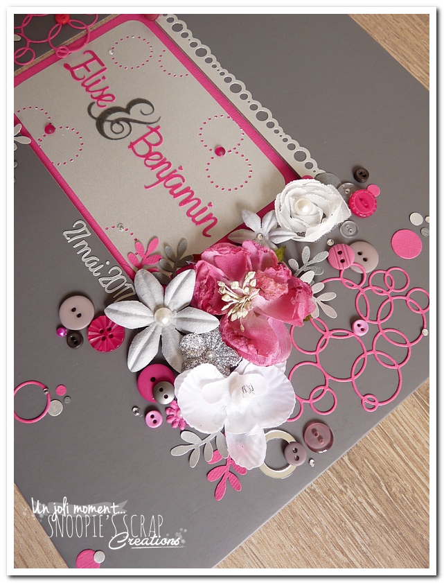 livre d’or, mariage Elise & Benjamin, boutons, blanc fushia &gris (touches argentées), fleurs (& bulles), mariage, wedding, pink, white, flowers, roses, orchidées, perles, strass, rubans, guest book.formule ENJOY