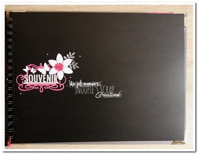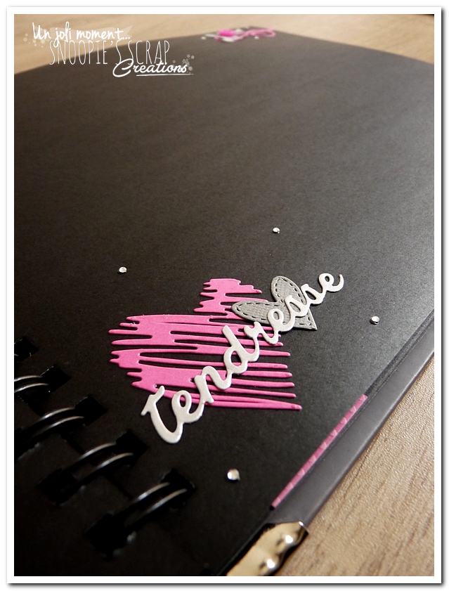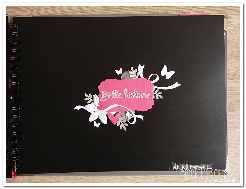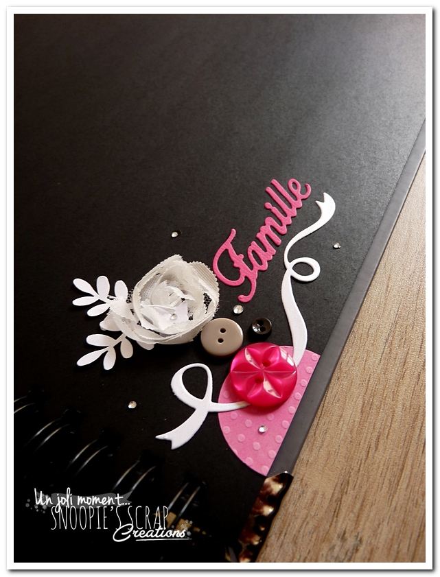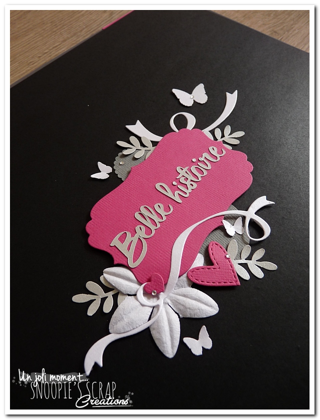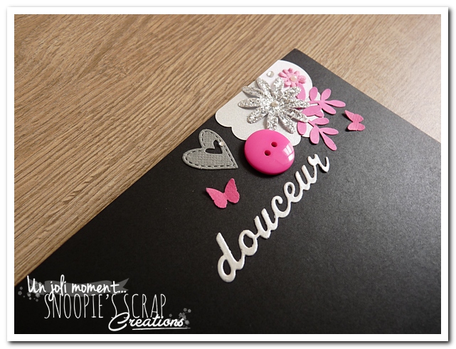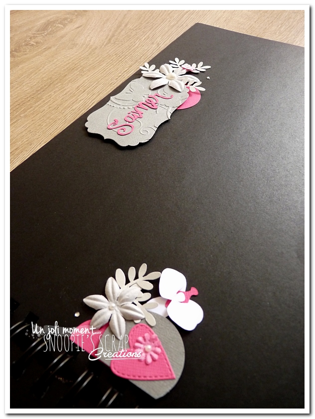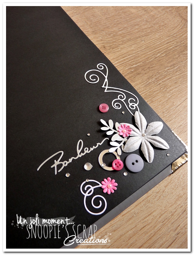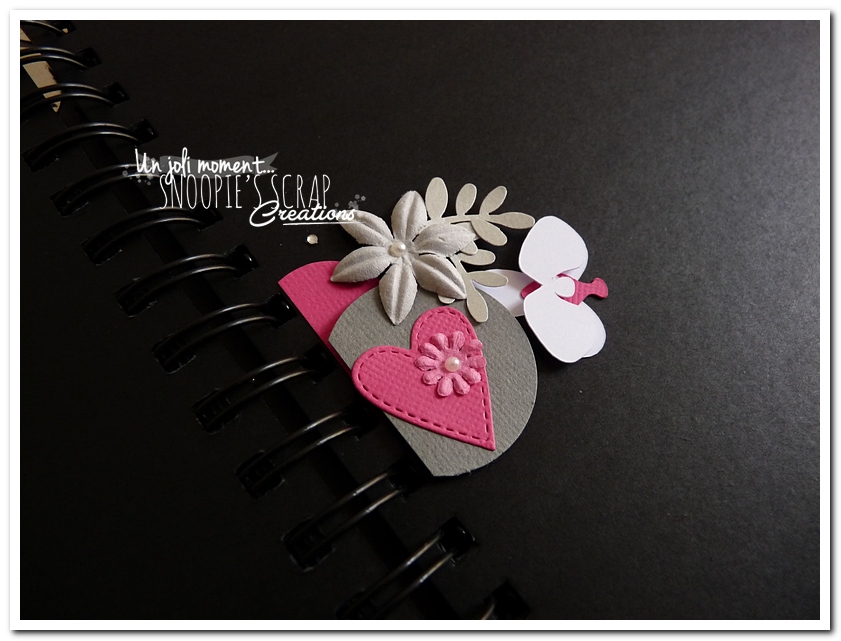 livre d’or, mariage Elise & Benjamin, boutons, blanc fushia &gris (touches argentées), fleurs (& bulles), mariage, wedding, pink, white, flowers, roses, orchidées, perles, strass, rubans, guest book.formule ENJOY
