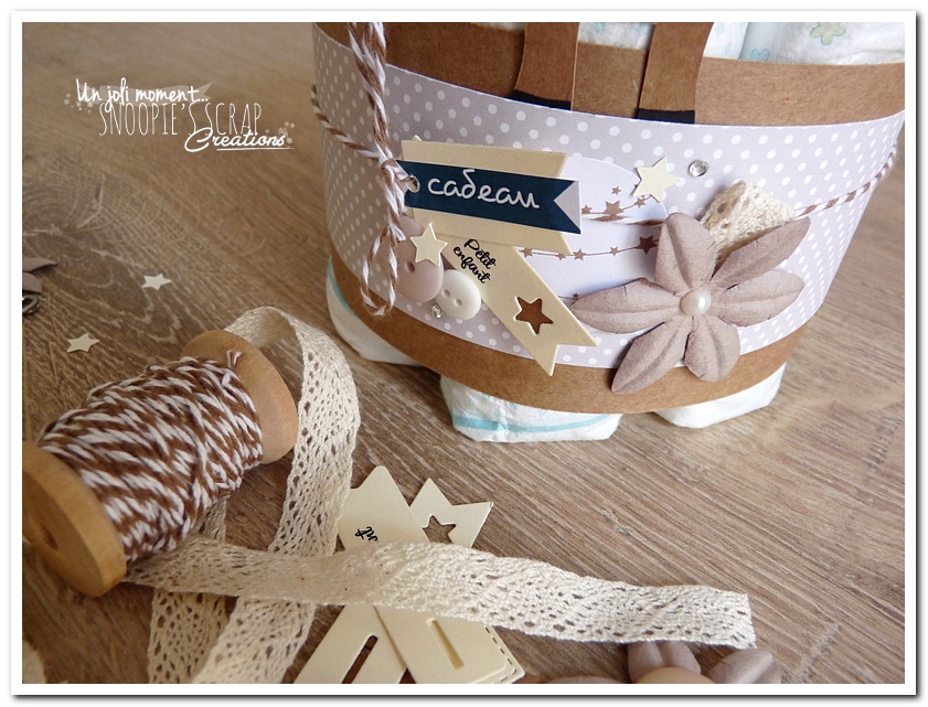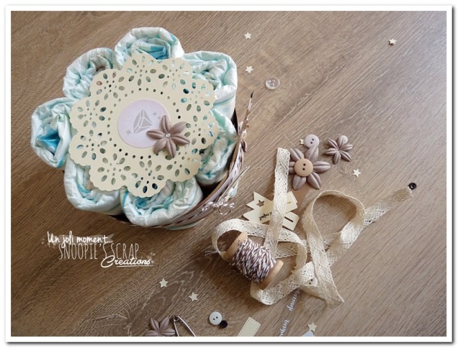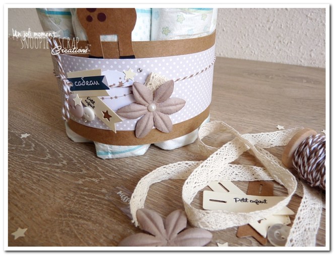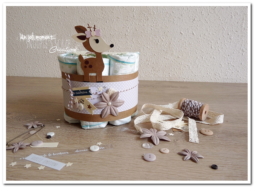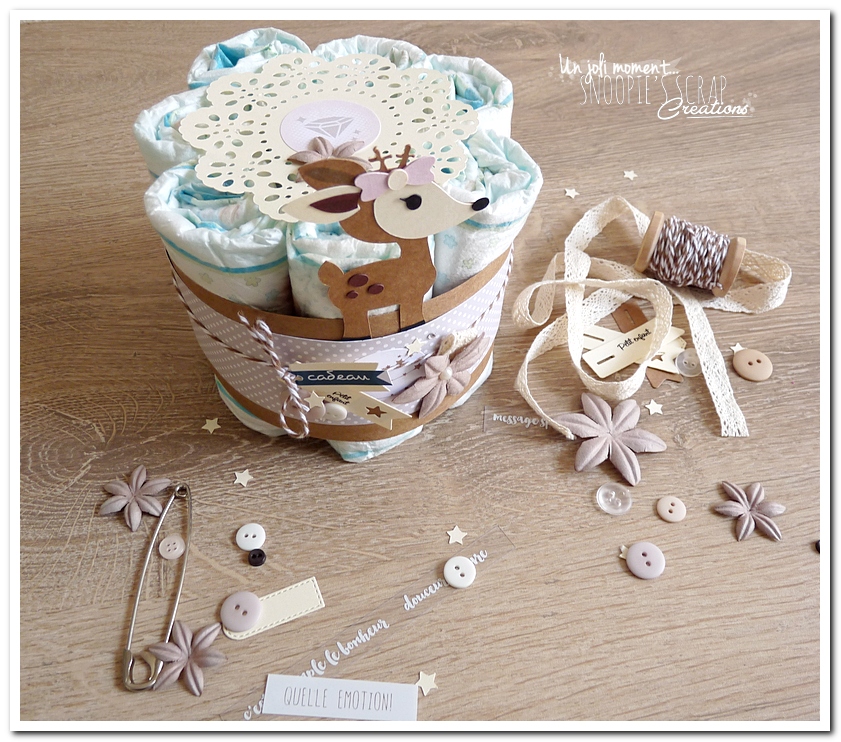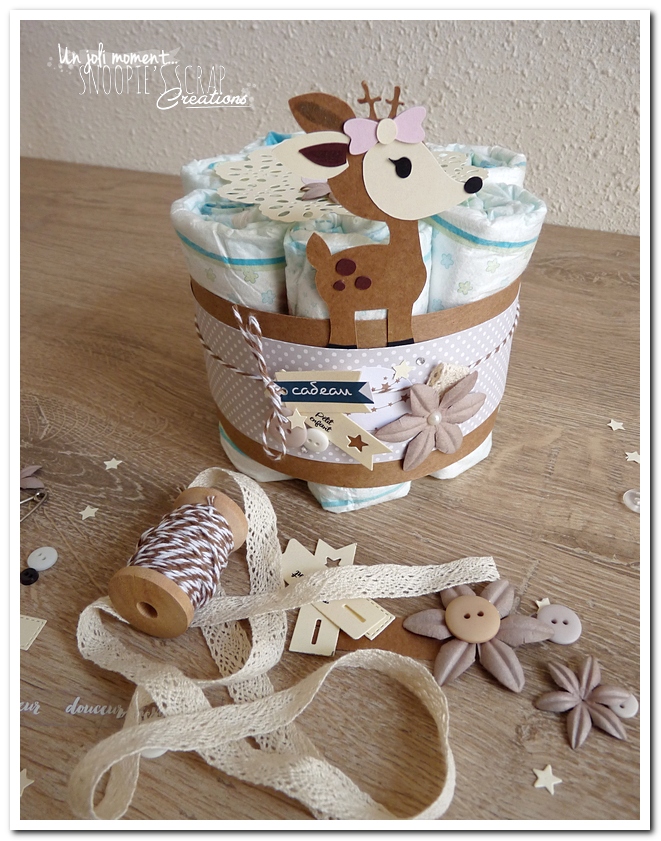 kraft, beige, ivoire, tons neutres, rose,naturel, tons naturels, faon, renne, fleur, ficelle, baker twine, napperon, étoiles, gâteau de couches, Naissance, Bienvenue, Clémence, cadeau, cadeau de naissance, quoi offrir pour une naissance, bébé qui vient de naître, présent, maternité, mixte, garçon, fille.