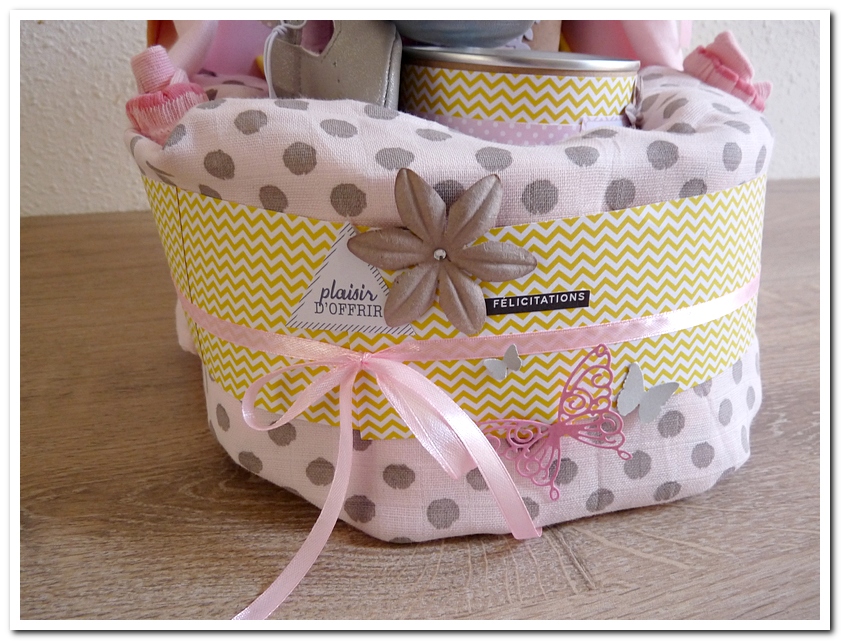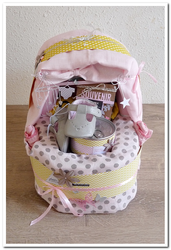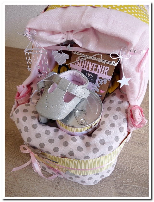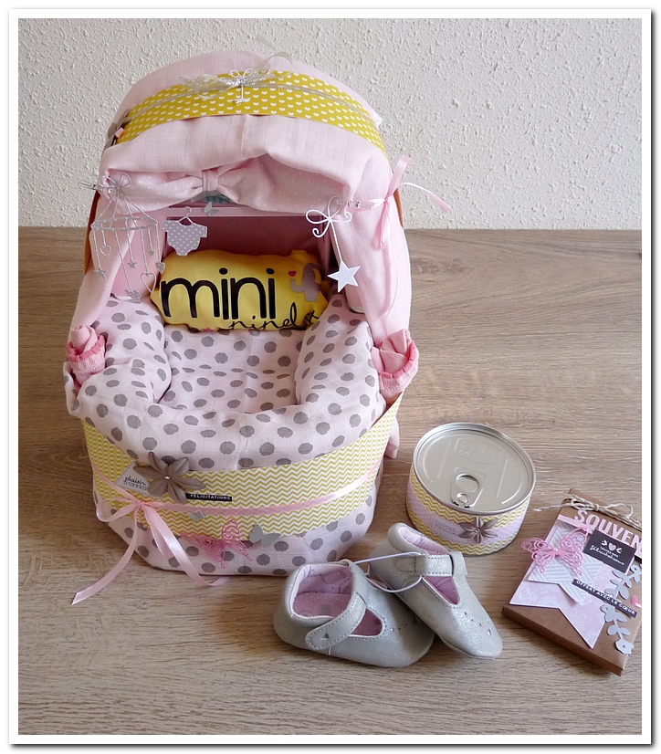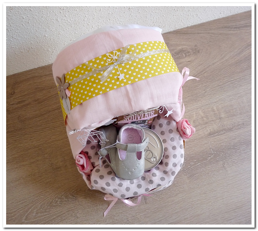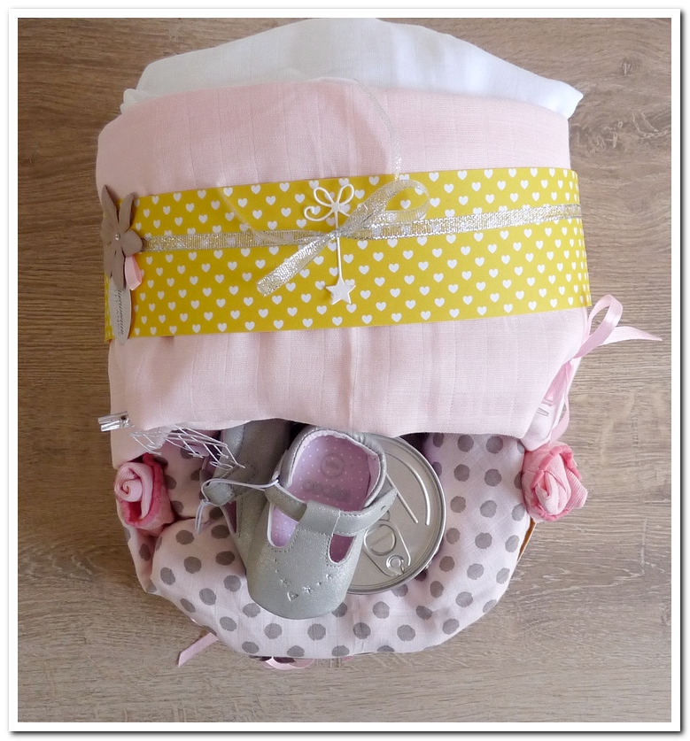 gâteau de couches, forme landeau lit, cadeau de naissance, fille, garçon, girly, rose, jaune, gris, grège, beige, neutre, douceur, doux, Klara.