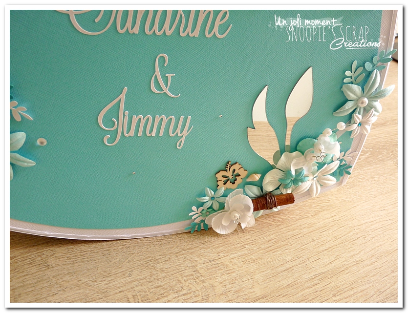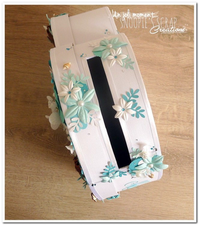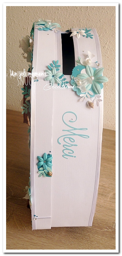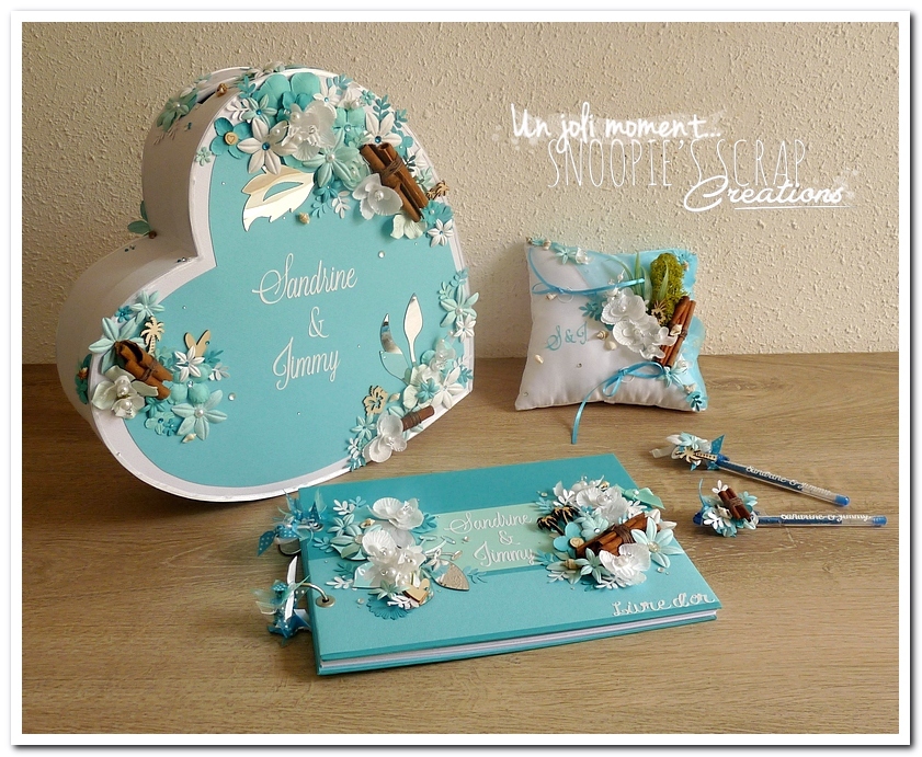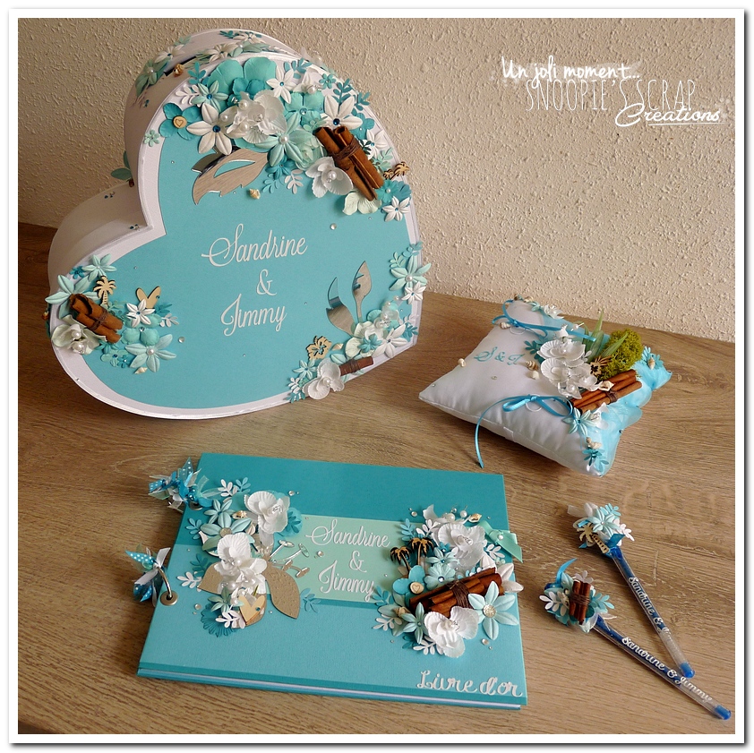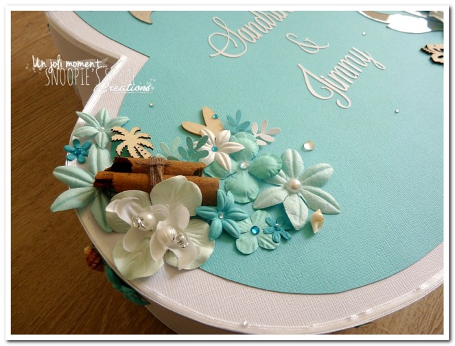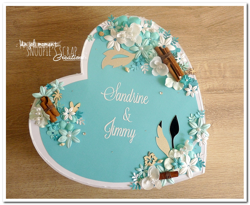 mariage, Sandrine & Jimmy, wedding, décoration, îles, exotique, turquoise, bleu, blanc, cannelle, orchidées, palmier, coquillage, plage, mer, feuillage, fleurs, perles, épuré. Urne, tirelire, boîte à rêves, boîte à voyage, voyage de noces. coeur debout plat.