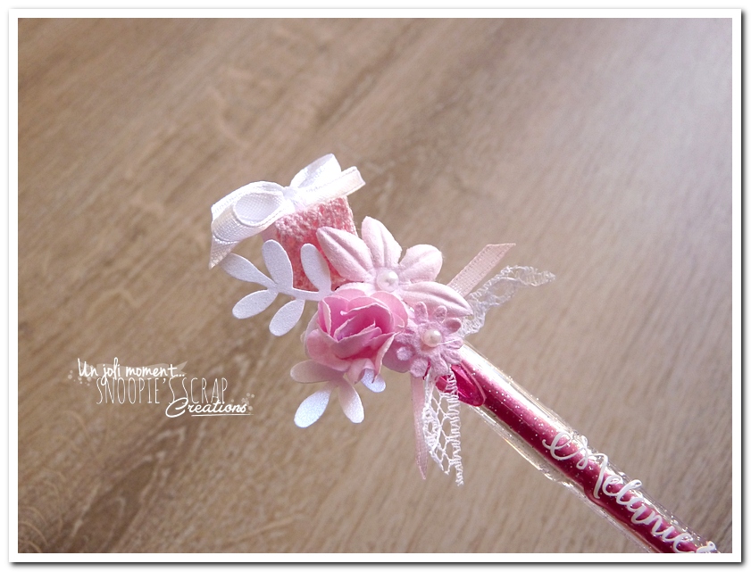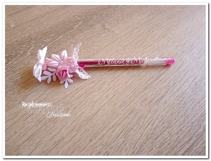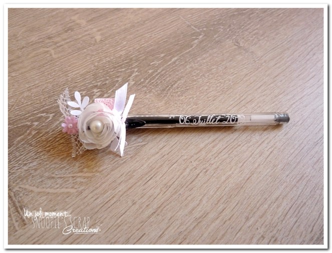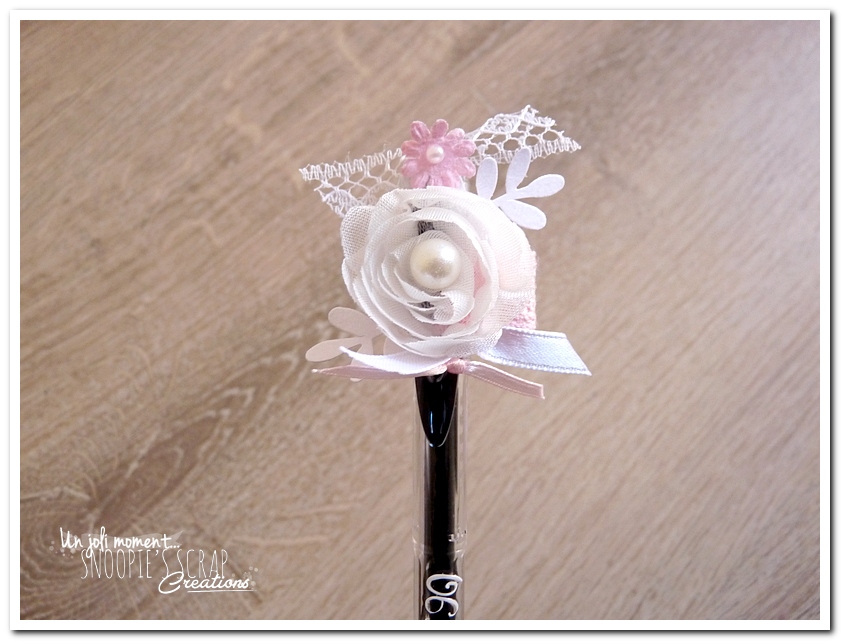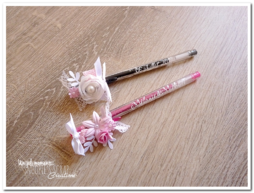 stylo décoré & personnalisé, mariage, pacs, mariage Mélanie & Mickaël, rose, blanc , fleurs, douceur, romantisme, romantique, roses, strass, paillettes, chic. épuré – dentelle, fleurs & perles/strass, touche argentée, sobre.