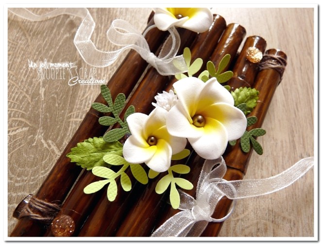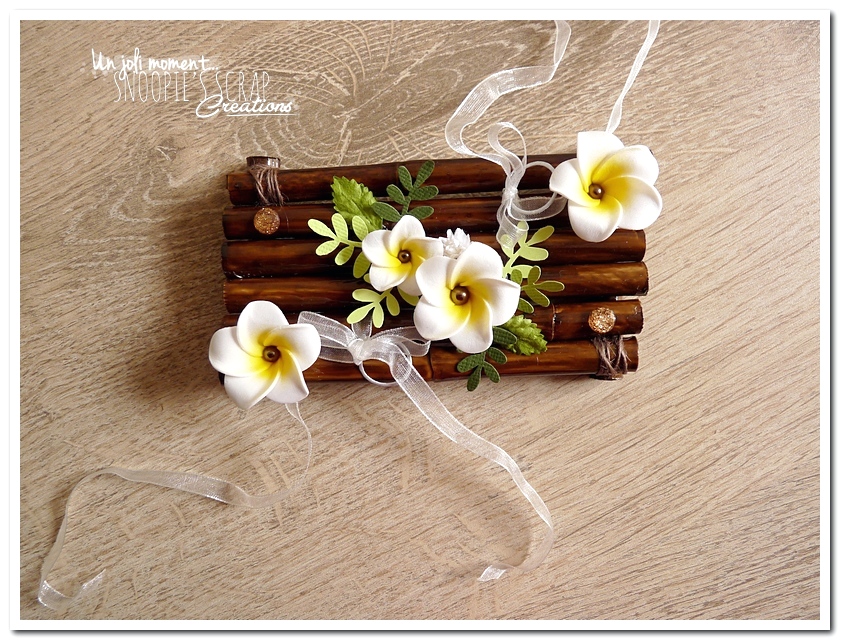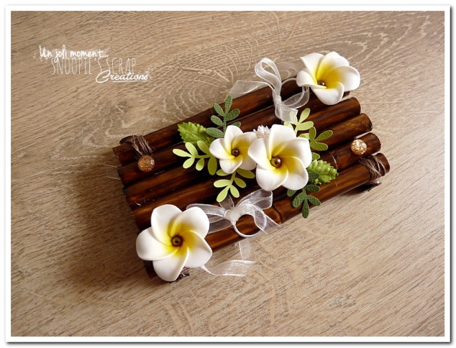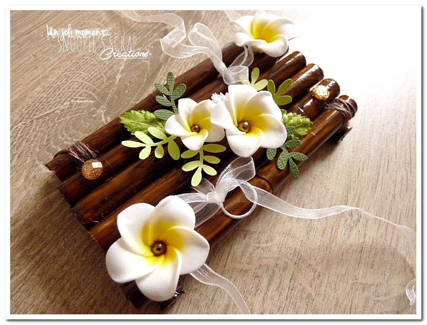 mariage, wedding, porte alliances, alliances, support alliances, coussin alliances, exotique, îles, bambou, bamboo, radeau, radeaux, île, chocolat, marron, blanc, vert, , fleurs, orchidee, cannelle, palmier, voyage, fleur de frangipanier. Alexandra & Corentin