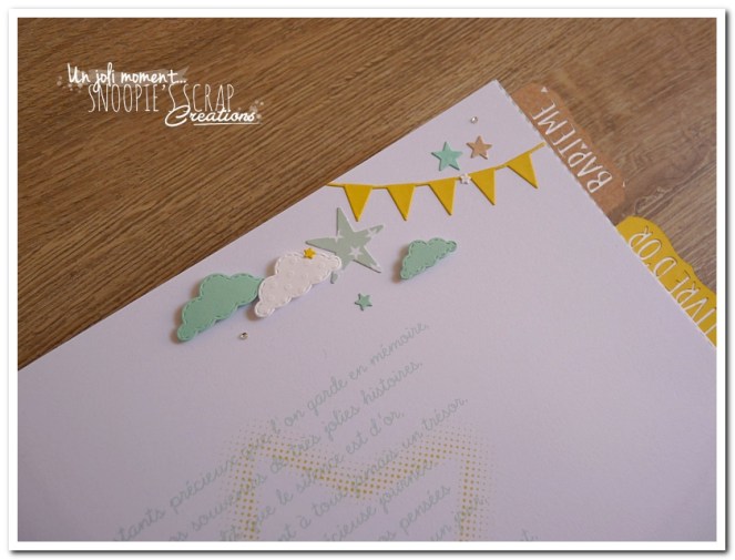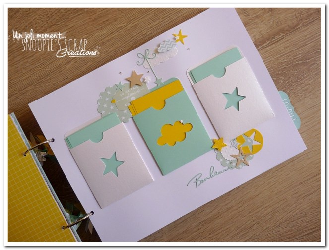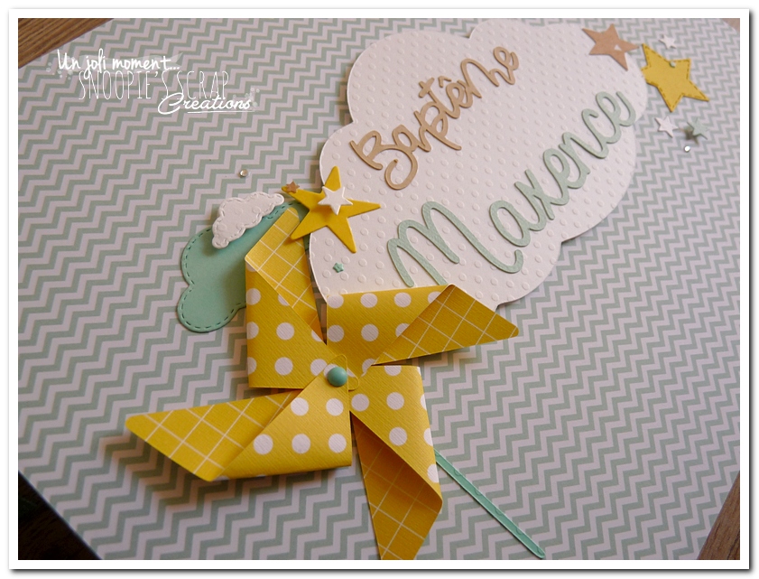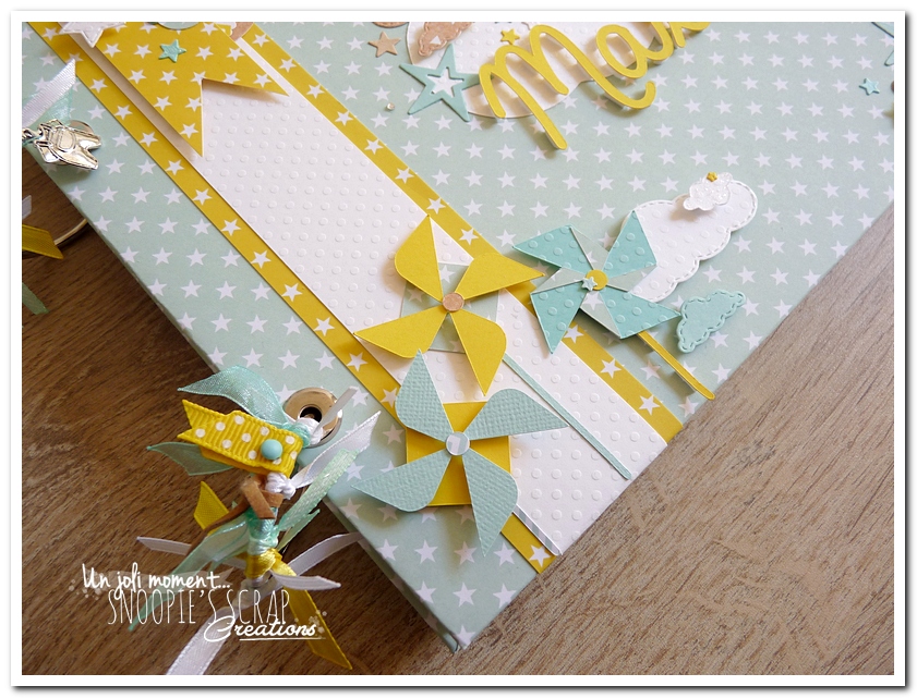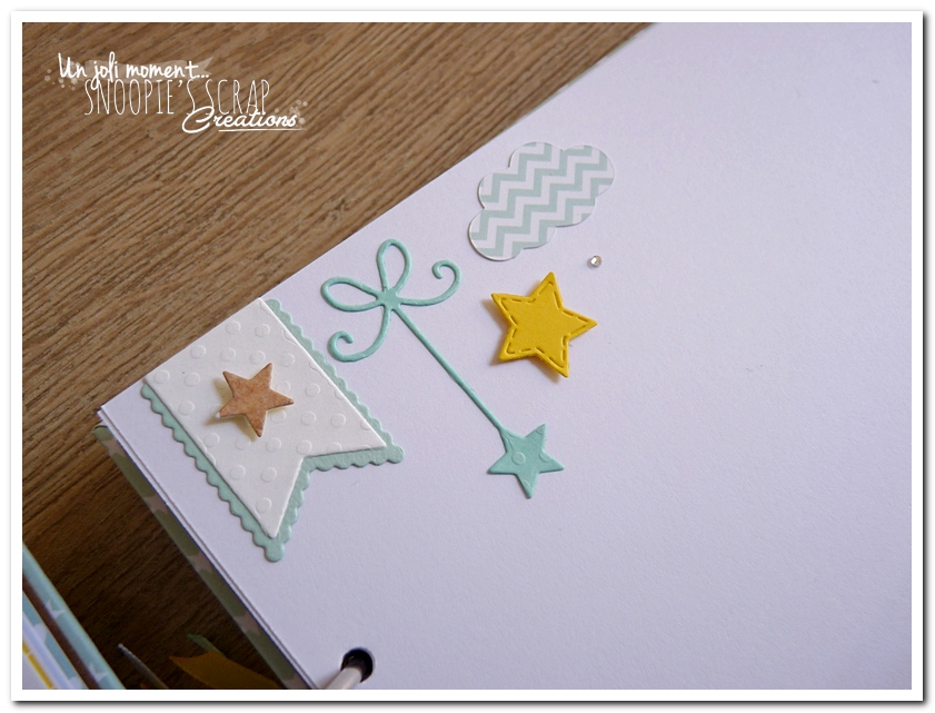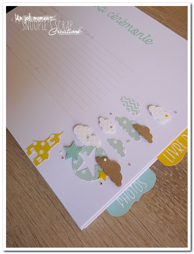 Baptême Maxence, chevrons, livre d’or, baptême, parrainage civil, mint, menthe, vert d’eau, blanc, jaune, jaune pale, pâle, jaune clair, kraft, kraft triangles, kraft sable mahé, nuages, rubans, fanions, étoiles, moulins à vent.