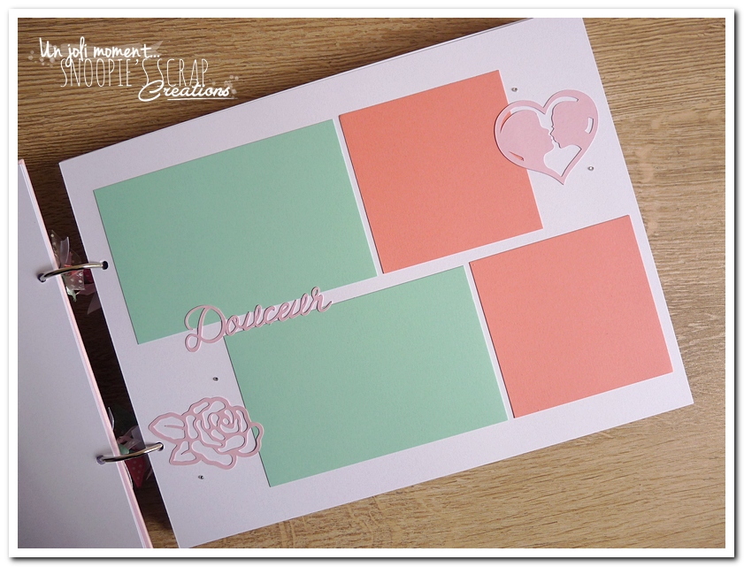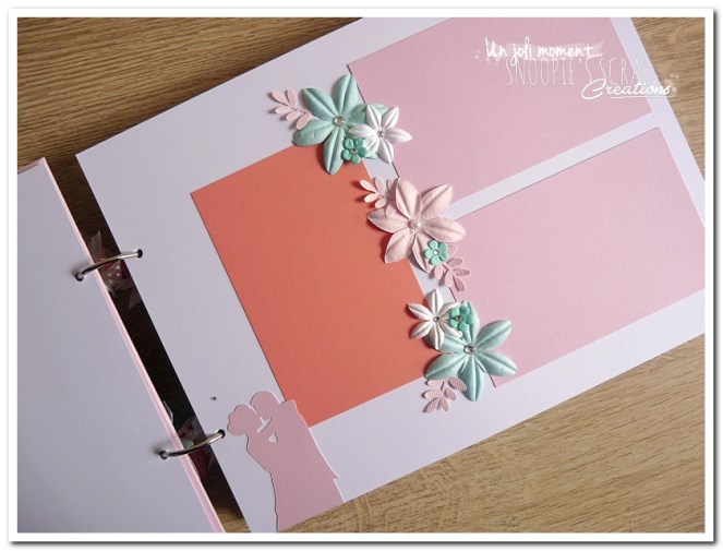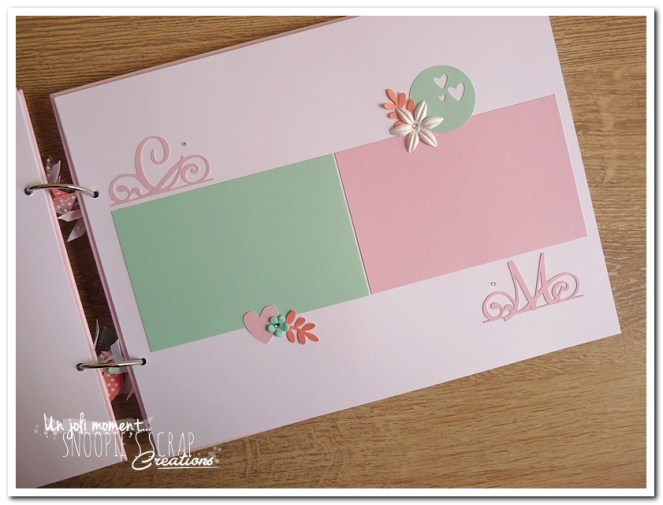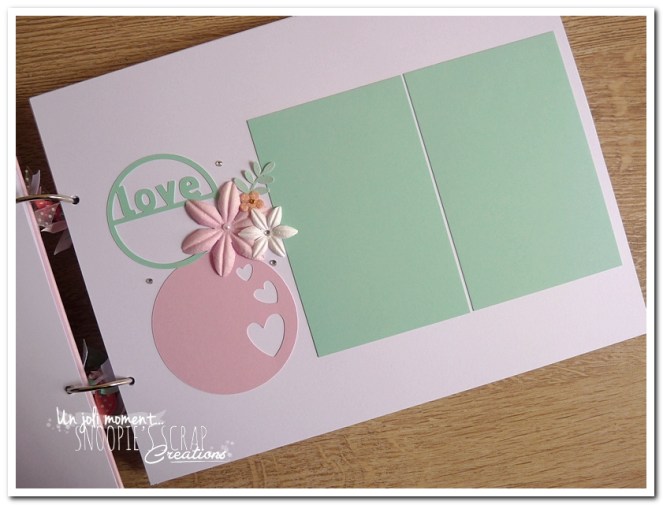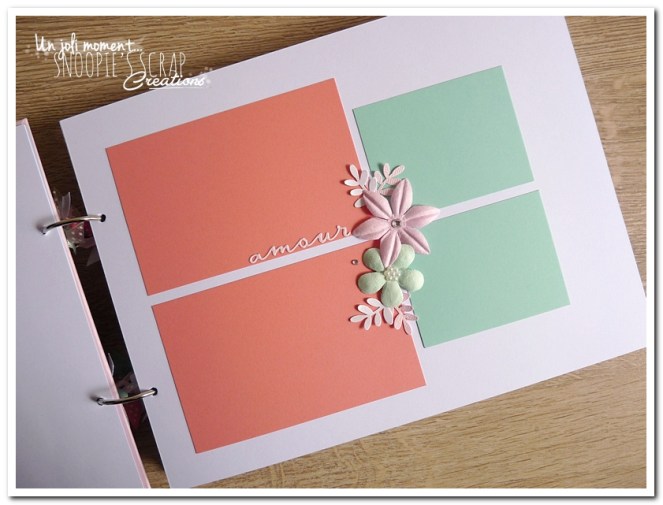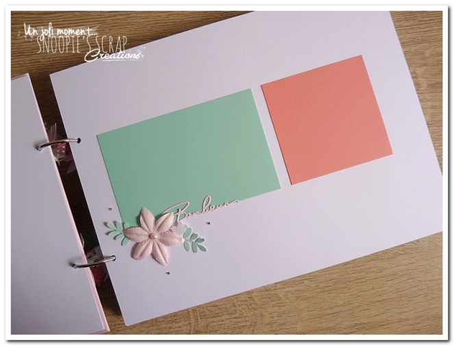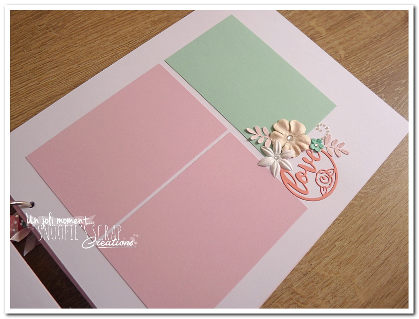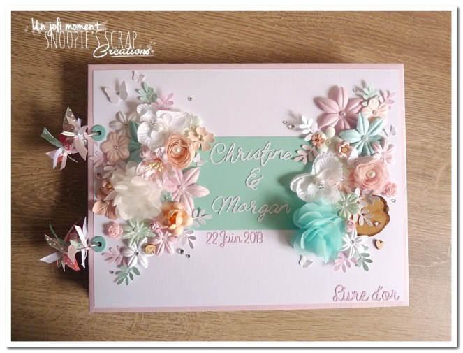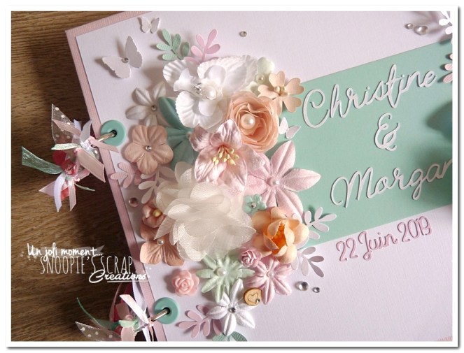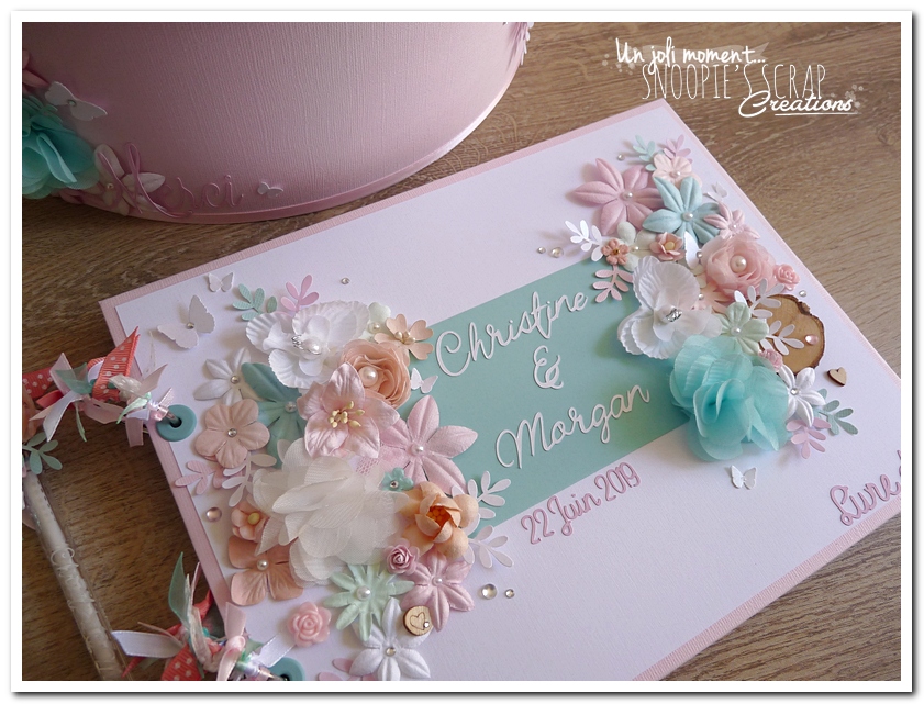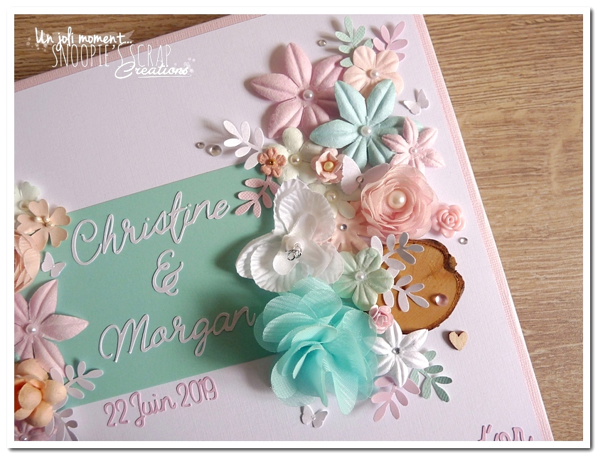 livre d’or mariage, rubans, fleurs, fleuri, bois, champêtre, vert menthe, mint, corail, pêche, rose, pastel, clair, fleurs, rondin de bois, nature, Christine & Morgan, livre d’or. FORMULE LOVE