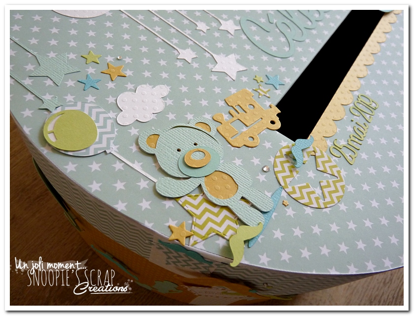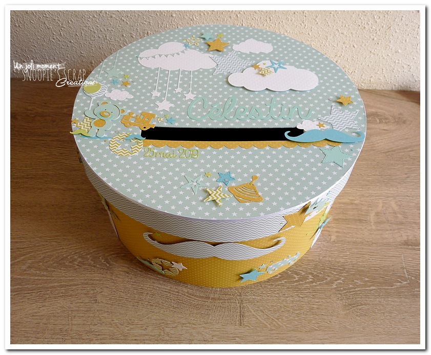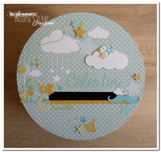Aujourd’hui je vous présente l’urne tirelire ronde de Célestin pour son Baptême.
