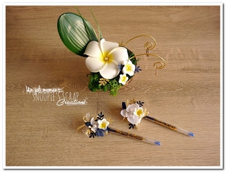 noix de coco, bleu, bleu marine, blanc, frangipanier, fleurs, coussin d’alliances, porte-alliances, feuillage .tropiques & chic. bleu marine & or, doré. Maëva&Maxime