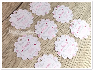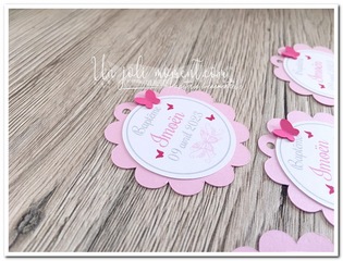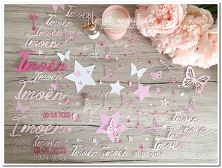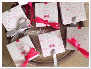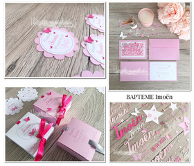 blanc, rose, gris argent, étoiles, nuages, papillons, Baptême de Imoën, fuchsia, fuchia, fushia, fuschia, fanions, guirlande, étoile suspendue, faire-part, baptême, faire-part de baptême, invitation baptême