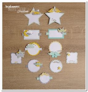 Bonjour, quelques étiquettes décorées pour accrocher sur des bonbonnières, ou pouvant faire office de marque-place/porte-noms pour une décoration de table. * Couleurs :  vert d’eau, jaune, blanc & gris Fil conducteur : Moustache (étoiles,  fanions, nuages, chevrons, pois…) ♥ Le mot de Céline, la maman d’Augustin: « Bonjour, Tout est parfaitement parfait!! Un grand merci!!! Bien cordialement Celine »… Lire la suite Etiquettes marque-place Augustin