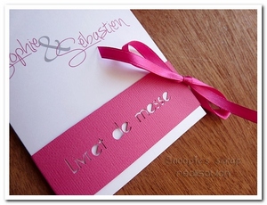Bonjour, Vous avez pu voir leur livre d’or, les stylos, les initiales , leur menu et bientôt leur livret de messe (celui retenu) sur mon blog. Voici un essai de livret de messe réalisé pour ébauche ;). Retrouvez un autre modèle ICI. Couleurs : fushia & blanc Les mariés avaient plusieurs idées en tête que j’ai essayé… Lire la suite Livret de messe bandeau Sophie & Sébastien (1)
