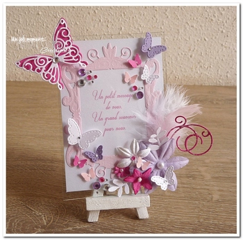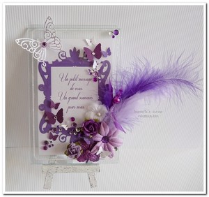 Bonjour, et voici la suite, après les stylos qui accompagneront le livre d’or et les initiales, que je vous montrerai, voici le petit cadre décoratif qui accompagnera le tout sur la table mise en place à cet effet. En vous souhaitant une très bonne journée, papillons, plumes, violet, prune, paillettes, blanc, strass, rhinestones, wedding, mariage, cadre,… Lire la suite Cadre décoratif Laetitia & Anthony