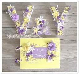 Et je termine par les initiales, basées sur celles de Bida & Wilfried. ♥ Couleurs : parme/lilas, jaune pastel & blanc Thématique : romantique : coeurs, strass, perles, rubans, noeuds, fleurs… ♥ Tout d’abord, l’image d’inspiration (envoyée par la mariée) : Retrouvez également : Retrouvez également le livre d’or : et les variantes, non retenues… Lire la suite lettres décorées Vania & Yannick