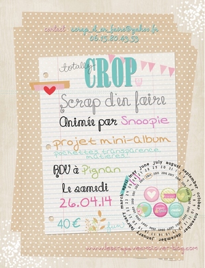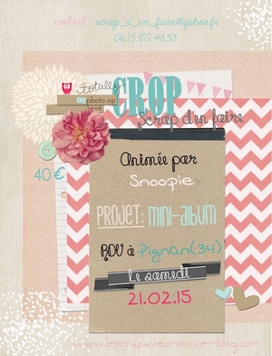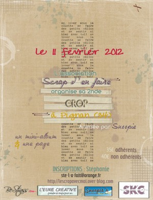 Bonsoir, j’espère que vous n’avez pas trop froid hihi! Je viens vous montrer quelques apercus de la crop du 25/02/12, si vous souhaitez vous inscrire sachez qu’il reste 3 places, vous pouvez vous inscrire en m’écrivant sur snoopiescrap@gmail.com. Bonne soirée,