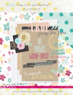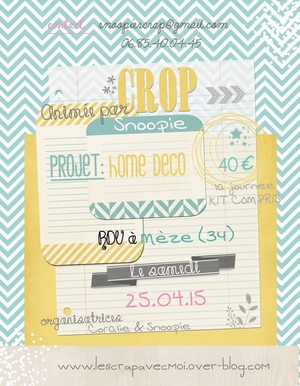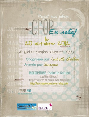 Coucou, une petite CROP ca vous dit? Elle aura lieu avec l’Association Scrap D’ En Faire, le samedi 28 novembre prochain! Venez réaliser un mini-album (aperçus à venir) avec nous! Si vous ne pouvez pas être là mais que vous souhaitez réserver un kit (avec pas à pas), n’hésitez pas à me contacter sur snoopiescrap@gmail.com.… Lire la suite CROP – Scrap d’en faire – 28.11.15