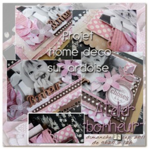 Coucou, merci pour vos commentaires !! Promis je reviens vite avec des créas « entières » lol. Voici donc un 3e atelier présenté à Folie’scrap! Une page ardoise, du rose, du marron, du blanc, de la douceur… Vous pouvez vous inscrire ICI (et voir toutes les autres informations) (et par ICI pour les autres informations sur… Lire la suite Atelier home déco ardoise "bonheur" FOLIESCRAP