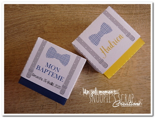 Bonsoir, voici les boîtes à dragées d’Hadrien, pour son Baptême. Sur la même base que celles de Florent, et celles de Benoit,  avec un H à la place d’une des découpes ajourées et le noeud papillon en mode Vichy ! Je vous montre également les quelques autres tests effectués mais non retenus! ♥ Couleurs : Jaune… Lire la suite Boîtes à dragées – Hadrien