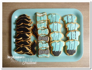 Bonsoir, j’avais fait des petits sugar cookies dans la même thématique pour faire joli sur la table et pour le bonheur des petits présents. ♥ Couleurs : bleu/vert d’eau, gris, kraft & noir Fil conducteur : étoiles, nuages, moustaches, bretelles, noeud pap, dandy chic ♥ Recette : sugar cookies de féerie cakes  + préparation pour glaçage… Lire la suite Gâteaux sweet table Florent