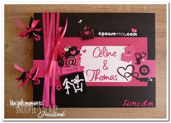 Bonsoir, un petit livre d’or copié sur celui de Valériane & Thomas. Uniquement la couverture. ♥ Couleurs : fushia & noir Thématique : rencontre en ligne – adopte un mec ♥ Le mot de Céline & Thomas : « Bonjour,  Nous avons bien reçu le livre d’or hier. Nous vous remercions, il est tout à fait… Lire la suite Livre d’or Céline & Thomas