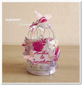 Bonsoir, voici maintenant l’urne assortie au reste. ♥ Couleurs : rose clair, rose fushia, blanc & parme Thématique : papillons, fleurs, cage à oiseaux ♥  Retrouvez les autres réalisations assorties en cliquant sur l’ image ci-dessous, vous aurez alors accès à chaque création: Le mot d’Amélie : « Tout est top, j’adore, très beau travail .… Lire la suite Tirelire Amélie & Jonathan