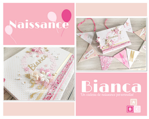 Cadeau de naissance Bianca – L’ensemble des réalisations. ♥ Couleurs : Tons de rose (clair, moyen, fuchsia), blanc & doré/or Thématique : Liberty, Printanier, Fleurs, pois, papillons, oiseaux, plumes, feuillages, arabesques, étoiles, nuages, fées, lapins…. ♥ L’ensemble : Le livre d’or : La guirlande de fanions : #naissancebianca ♥ Le mot de Coralie : « Merci à… Lire la suite Ensemble Cadeau de NAISSANCE – Bianca