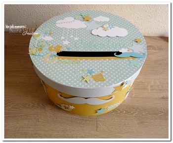 Bonjour, Aujourd’hui je vous présente l’urne tirelire ronde de Célestin pour son Baptême. Sur la base de celle de Léana avec une décoration sur les côtés plutôt type tirelire d’Arthur(1). ♥ Couleurs : tons de turquoise, aqua, vert d’eau, jaune moutarde & vert anis Thématique :  Moustache + tout ce qui est relatif à l’enfance :… Lire la suite Tirelire Célestin