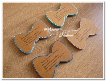 Bonjour, Chantal souhaitait des étiquettes à rajouter à ses cadeaux d’invités. Voici donc des étiquettes de remerciement en forme de noeud papillon. ♥ Couleurs : tons de bleu (clair, marine, pétrole, roi…), kraft (clair & foncé), gris, noir & turquoise Fil conducteur : moustache, étoiles, chapeaux, p’tit mec, noeud papillon, bretelles, dandy chic ♥ ♥ ♥… Lire la suite Etiquettes remerciement pour cadeaux d’invités – Benoit (2)