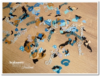 Bonsoir, pour compléter la décoration de table, voici des confettis dans la thématique, à éparpillés un peu partout sur la sweet table et/ou les tables de repas. ♥ Couleurs : tons de bleu (clair, marine, pétrole, roi…), kraft (clair & foncé), gris, noir & turquoise Fil conducteur : moustache, étoiles, chapeaux, p’tit mec, noeud papillon, bretelles,… Lire la suite Papeterie Sweet table – confettis – Benoit (2)